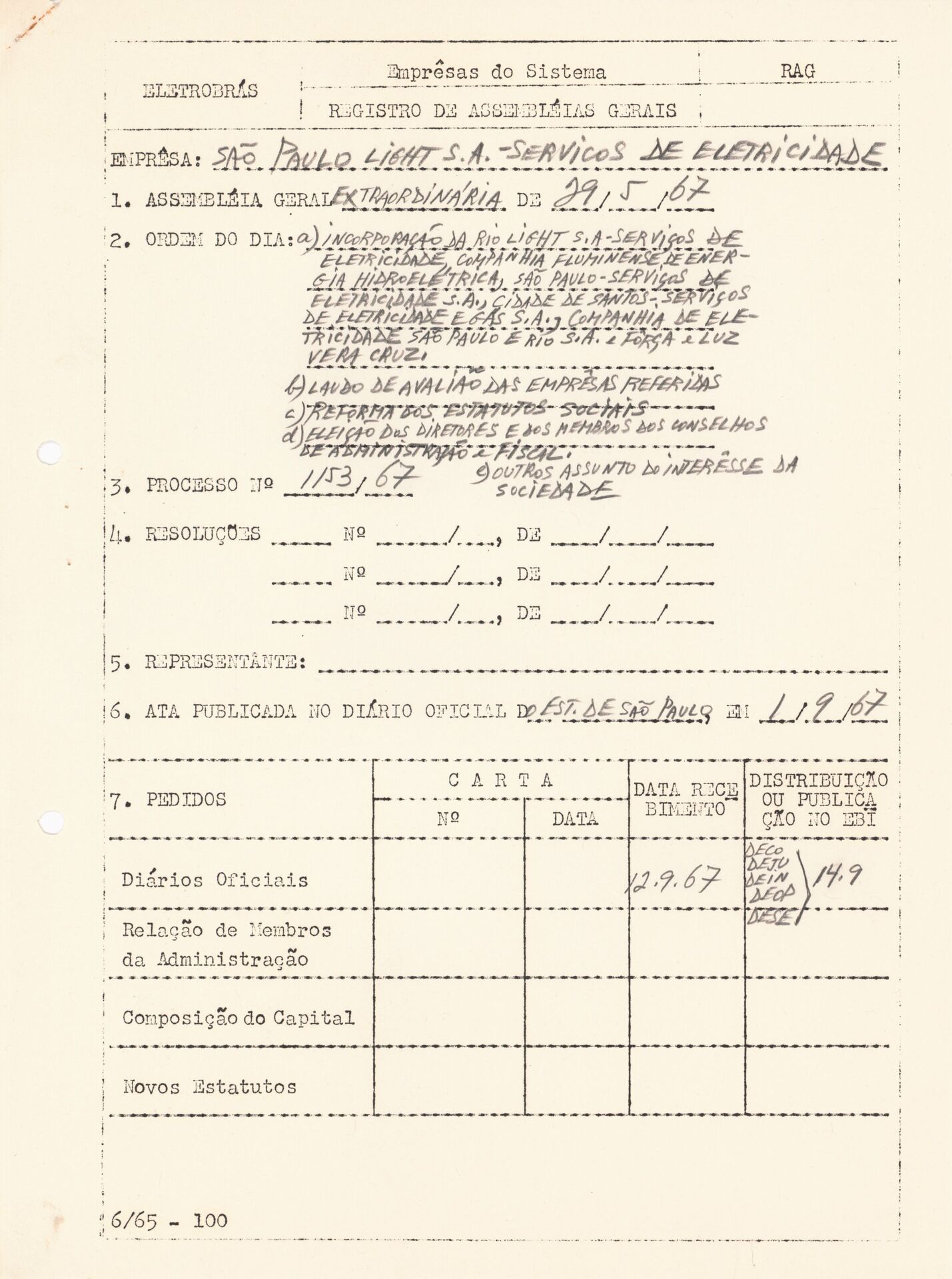 Registro de Assembleia da São Paulo Light S.A. - Serviços de Eletricidade de maio de 1967