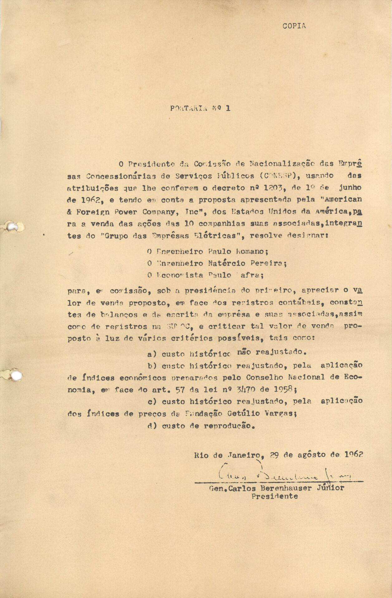 Documentos referentes ao histórico das reuniões e trabalhos desenvolvidos pela comissão de nacionalização das Empresas Concessionárias de Serviços Públicos - CONESP, designada pela portaria n°1, 29/08/1962, para estudo da proposta apresentada pela American & Foreigner Power CO. Inc. - AMFORP, relacionada à venda das ações das dez companhias associadas, integrantes do grupo das Empresas Elétricas.