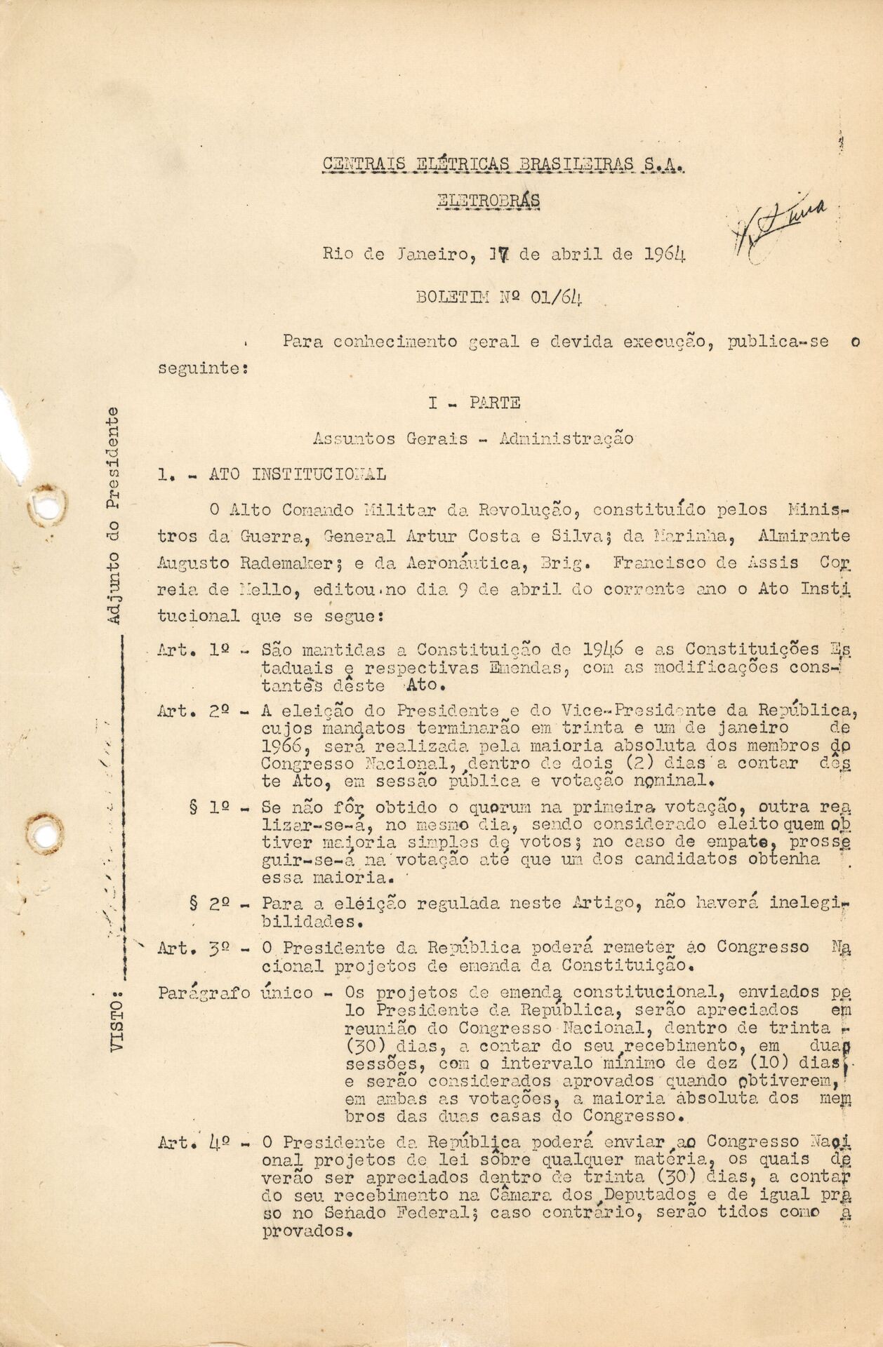 Dossiê composto por documentos reunidos relativos aos boletins informativos produzidos pela Eletrobras no ano de 1964, contendo informações institucionais, administrativas e técnicas sobre as atividades, projetos e diretrizes da empresa no período.