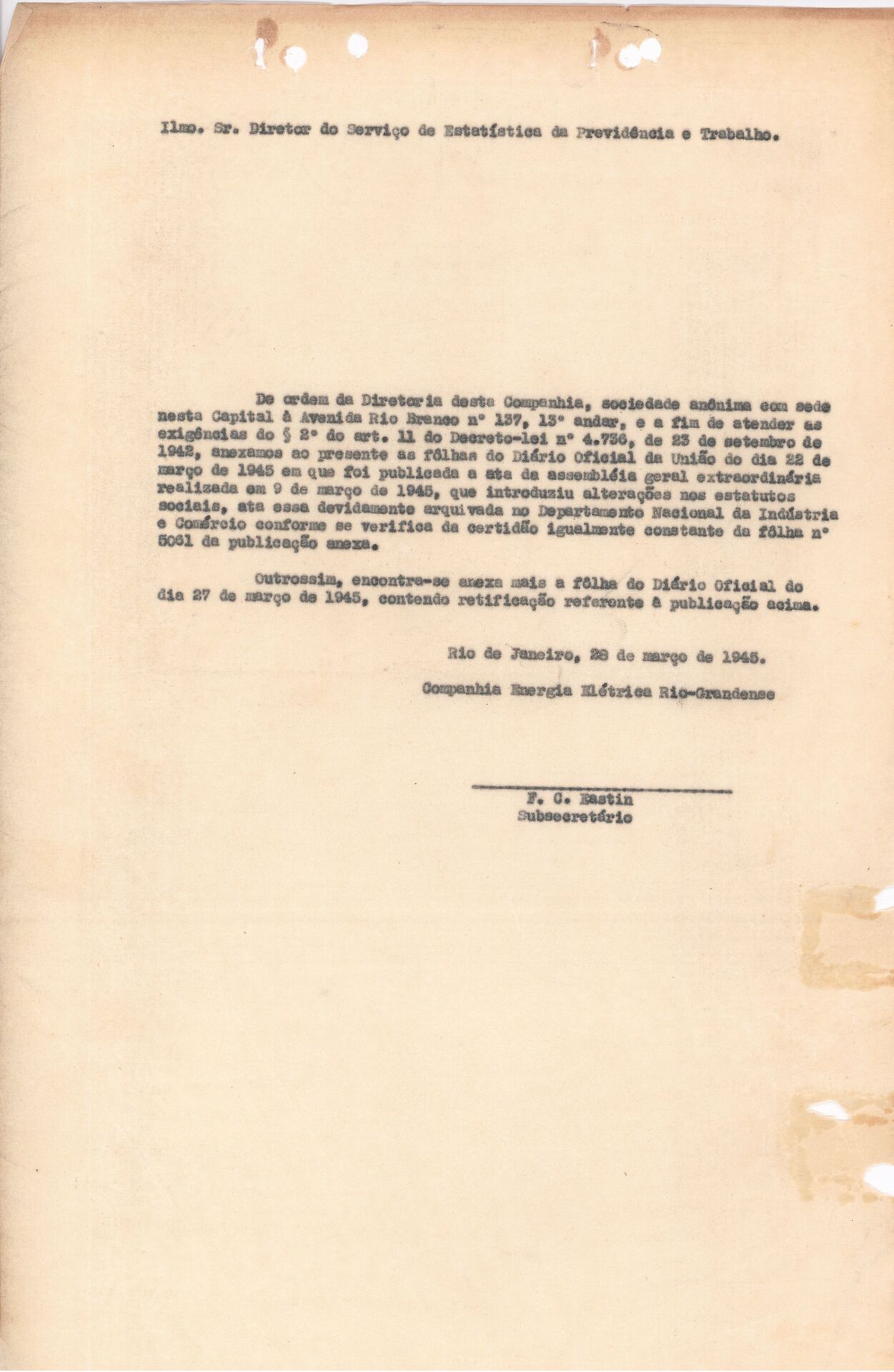 Registro da Assembleia Geral Extraordinária da Companhia de Energia Elétrica Rio Grandense em março de 1945