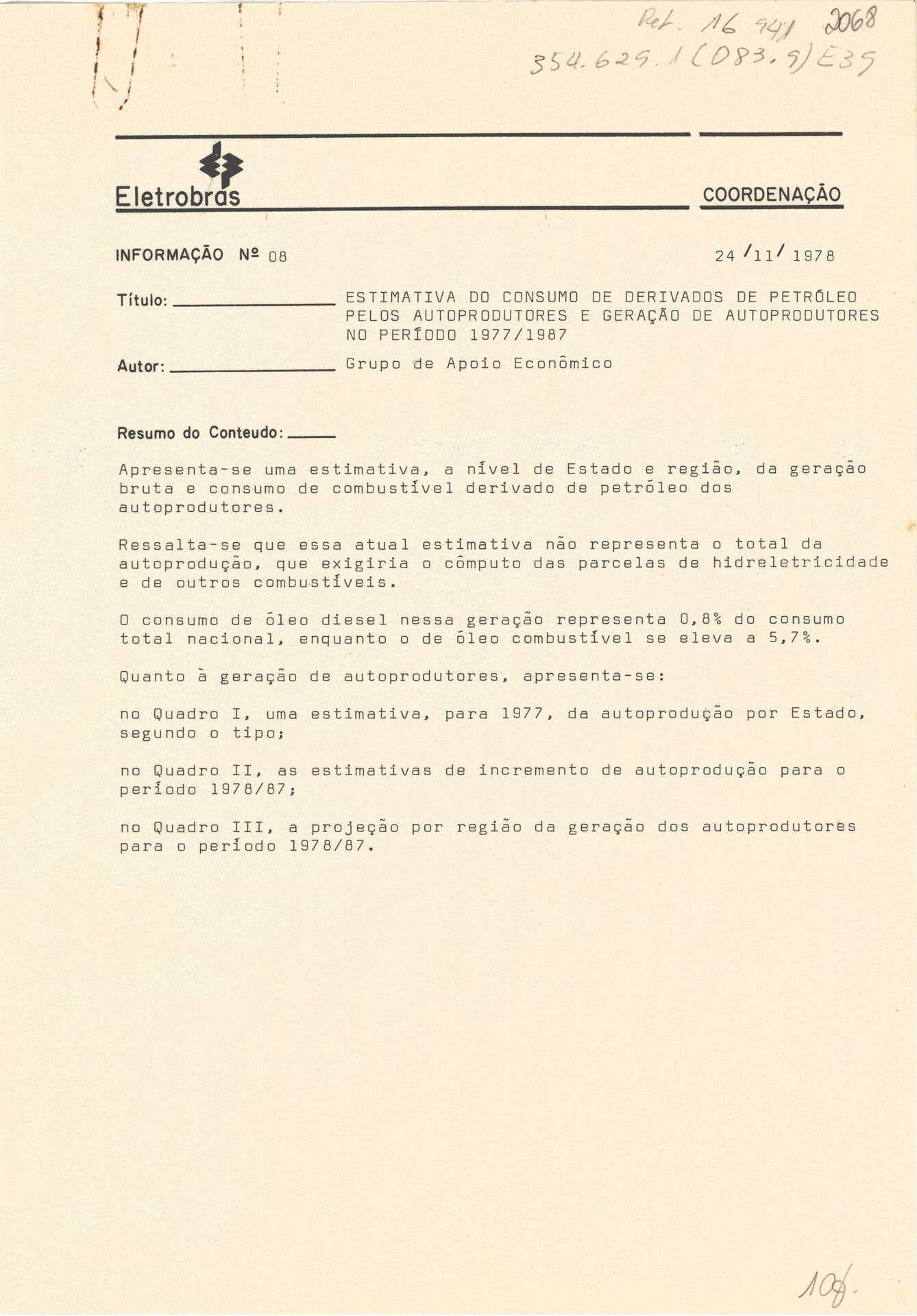 Documentos referentes às estimativas de geração bruta de energia e ao consumo de combustíveis derivados de petróleo por autoprodutores, elaboradas pelo Grupo de Apoio Econômico, abrangendo o período de 1977 a 1987. A documentação apresenta dados organizados em níveis estadual e regional, incluindo análises quantitativas, projeções setoriais e quadros comparativos, destinados a subsidiar estudos de planejamento energético, a avaliação da participação da autoprodução na matriz energética e a formulação de políticas de suprimento e uso de combustíveis no setor elétrico.