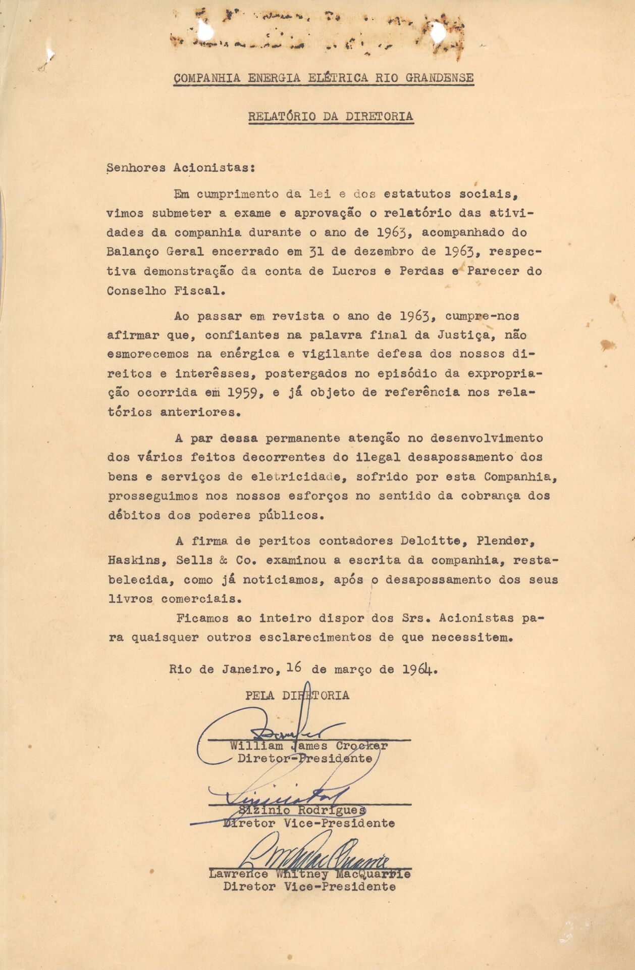 Documentos referentes às informações produzidas pela diretoria e pelo conselho fiscal da Companhia de Energia Elétrica Rio Grandense (CEERG), abrangendo análises administrativas, operacionais e financeiras referentes ao período de 1959 a 1963. O conteúdo reúne apreciações sobre o desempenho institucional, decisões estratégicas e registros das atividades de gestão e fiscalização conduzidas no intervalo mencionado.