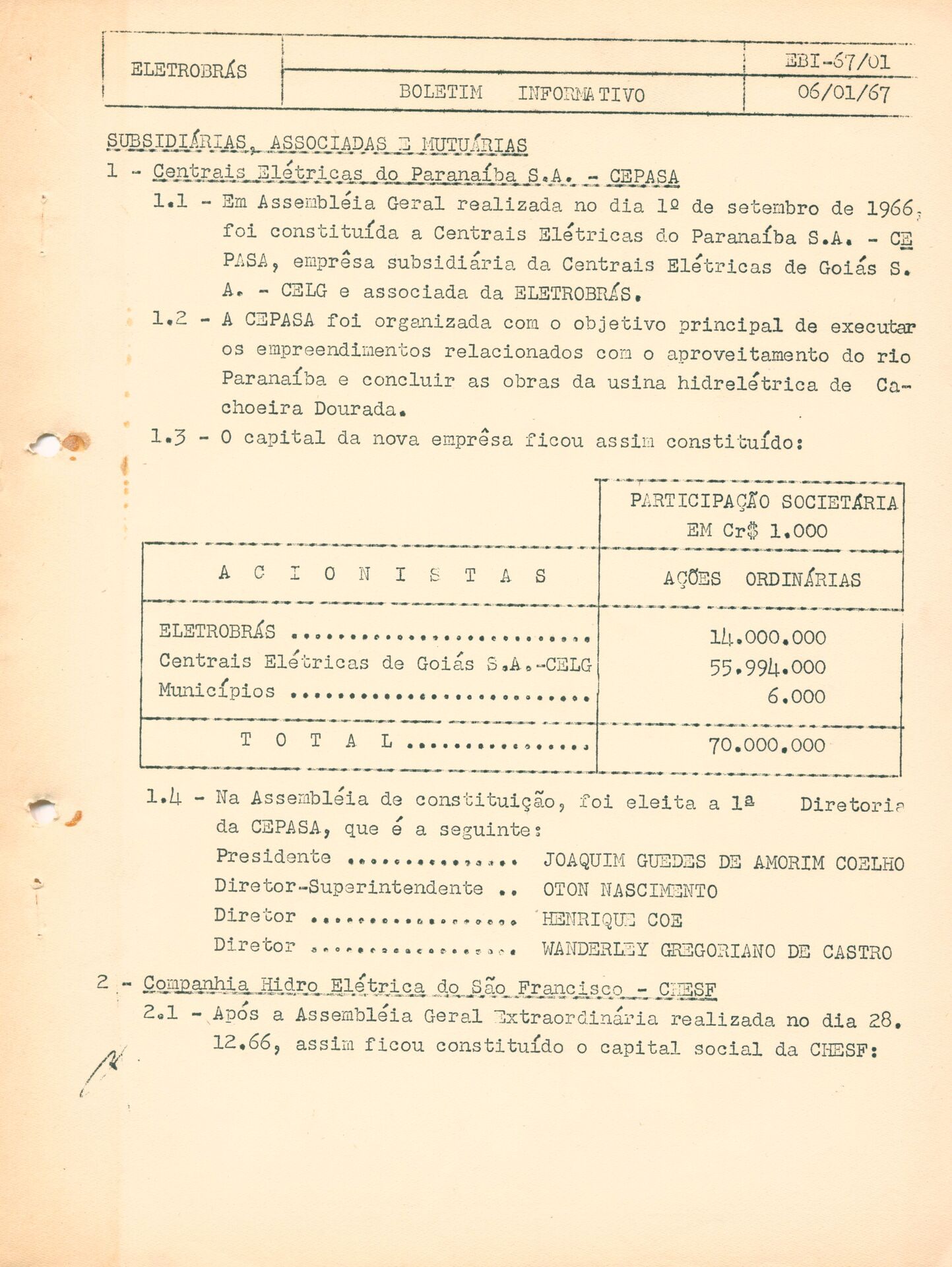 Informações institucionais e atualizações sobre as atividades da Eletrobras em 1967