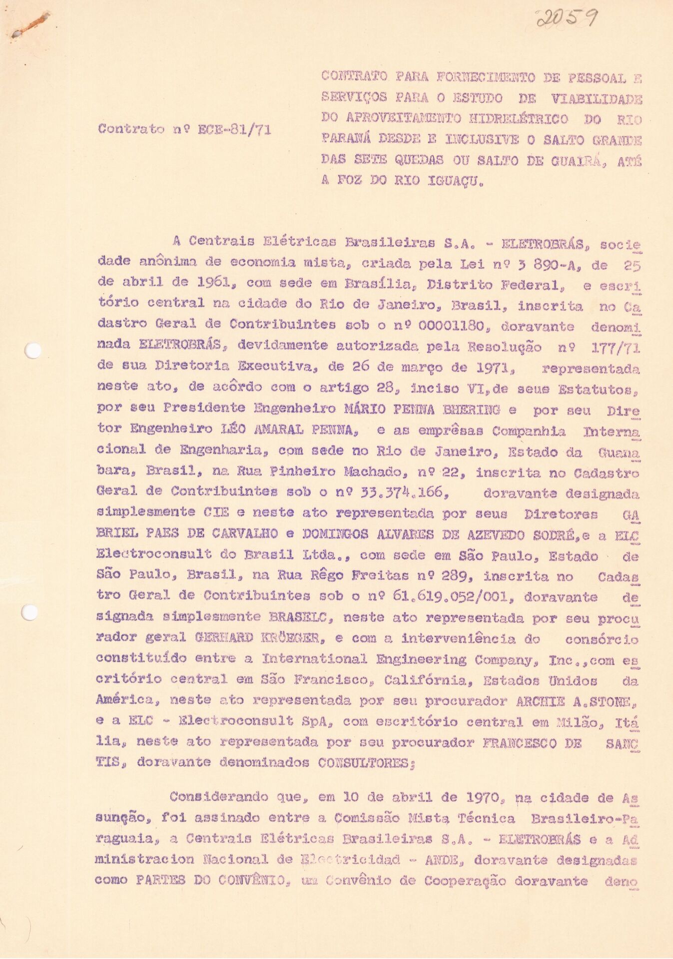 Documentos referentes a contratos firmados pela Eletrobras para a prestação de serviços de consultoria e engenharia, incluindo acordo com a Montreal Engineering Overseas Ltd.; contrato para fornecimento de pessoal técnico e execução de estudos de viabilidade do aproveitamento hidrelétrico do rio Paraná, no trecho compreendido entre o Salto Grande das Sete Quedas (Salto de Guaíra) e a foz do rio Iguaçu, celebrado entre a Eletrobras, a Companhia Internacional de Engenharia e a Electroconsult do Brasil Ltda.; bem como contrato de prestação de serviços profissionais de engenharia firmado entre a Comissão Mista Técnica Brasileira–Paraguaia, a Eletrobras, a Administración Nacional de Electricidad - ANDE e a International Engineering Co. Inc.