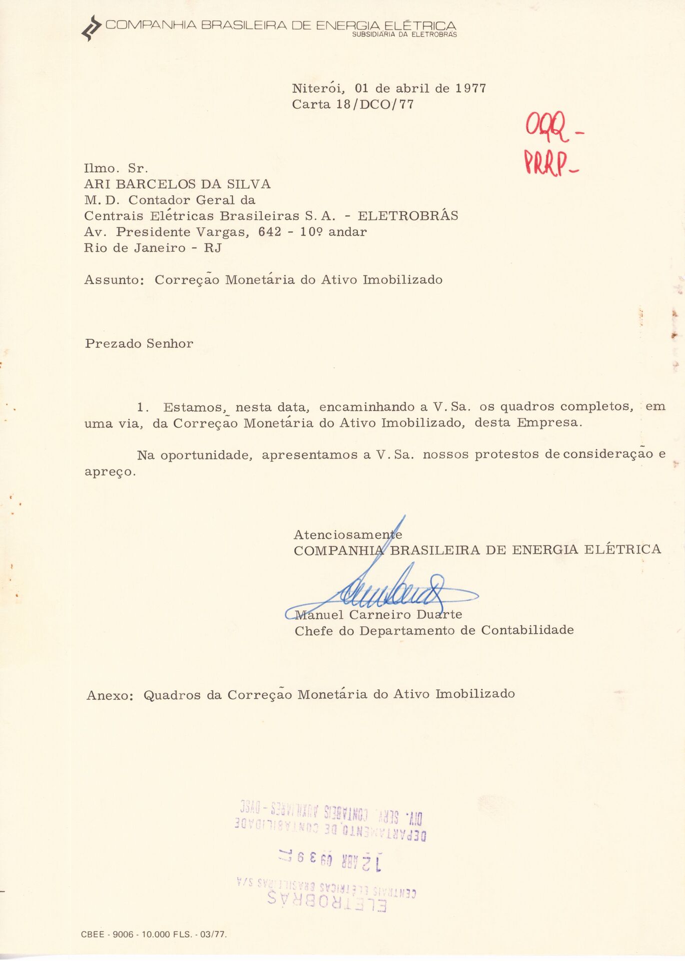 Conjunto documental relativo ao processo de correção monetária do ativo imobilizado da Companhia Brasileira de Energia Elétrica, referente ao exercício de 1977, encaminhado à Centrais Elétricas Brasileiras S.A. – Eletrobras. Reúne informações contábeis e patrimoniais, critérios de atualização monetária aplicados, quadros demonstrativos e elementos técnicos utilizados na reavaliação dos bens da companhia, permitindo acompanhar os procedimentos adotados para adequação dos valores patrimoniais às normas vigentes.