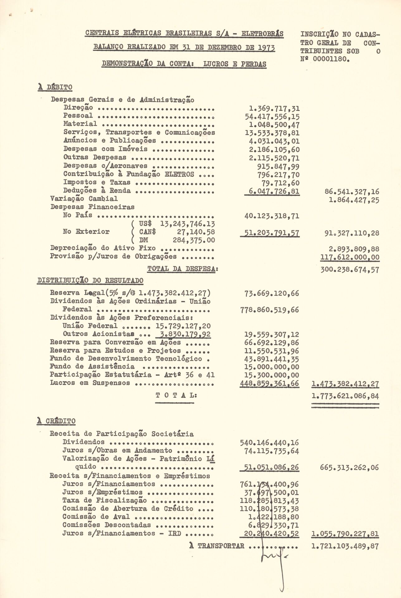 Documentos relativos à apuração dos resultados econômicos da Centrais Elétricas Brasileiras S.A. – Eletrobras no exercício de 1973, contendo registros de receitas, despesas, custos operacionais e demais elementos necessários à análise do desempenho financeiro da empresa e à verificação de seus lucros ou prejuízos no período.