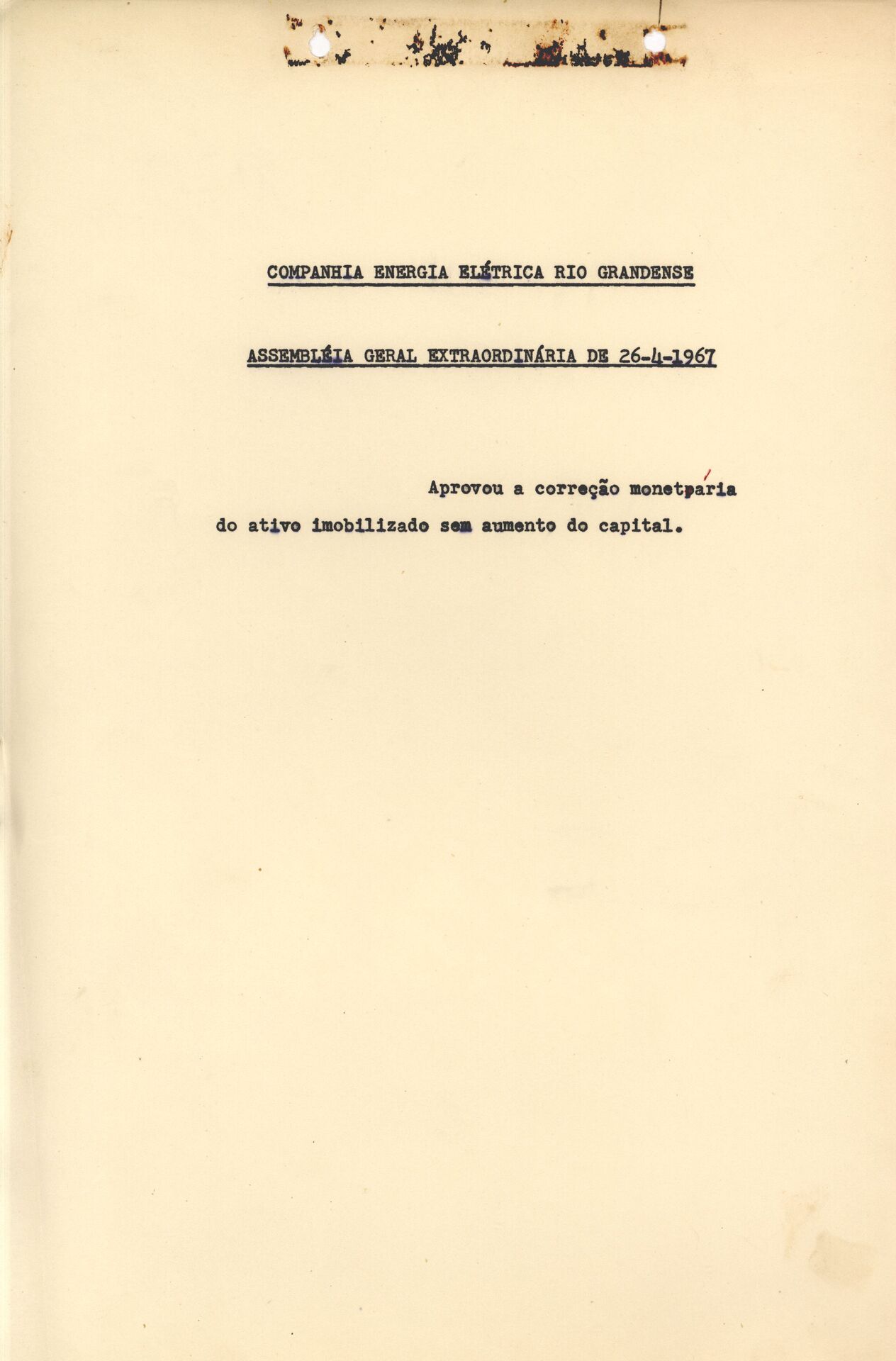 Documentos relativos à correção monetária da Companhia de Energia Elétrica Rio Grandense - CEERG, definida em Assembleia Geral Extraordinária realizada em abril de 1967, incluindo ata da reunião e demais registros formais associados ao processo de atualização monetária deliberado pela empresa.