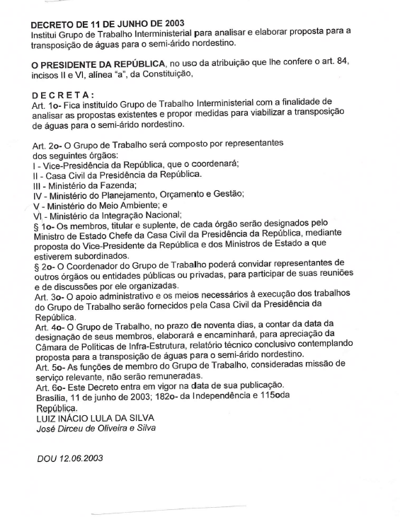 Decreto que institui Grupo de Trabalho Interministerial para analisar e elaborar proposta de transposição de águas para o semi-árido nordestino; Plano de expansão preliminar de geração de usinas; e relatório com o acompanhamento da implementação das metas estabelecidas nos planos decenais de energia.